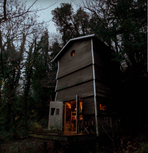 Set in an acre of wooded hillside gardens, overlooking the park river and town of Okehampton below, with the wild and rugged moor of Dartmoor above and the woods between ,are three unique hand built dwellings designed’ just for two’ to relax and enjoy valued ‘together time’. Built using locally sourced and recycled materials, specifically in ways that encourage their natural submersion back into the vegetation.